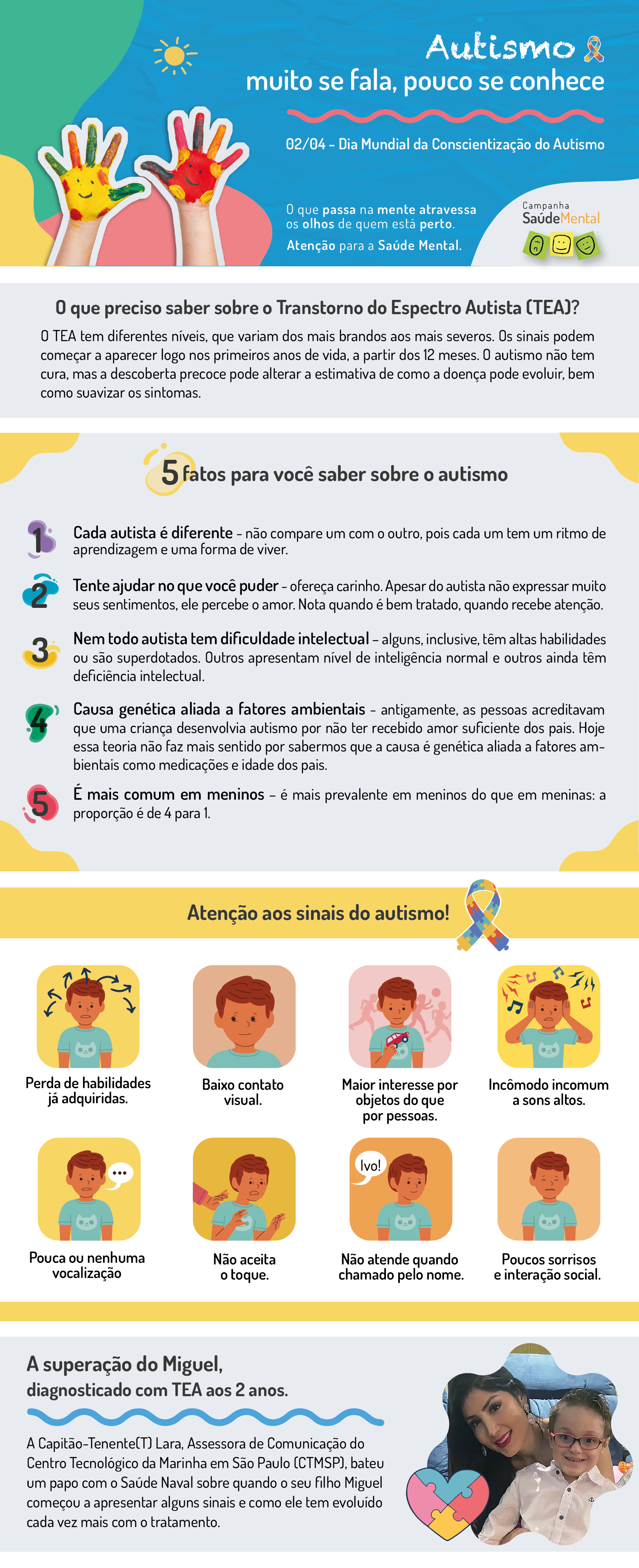 Hoje, o Miguel é muito sociável, ama os amiguinhos e brinca bastante com outras crianças com quem ele criou um vínculo afetivo. Inventa suas próprias brincadeiras, que são peculiares e pouco ordenadas, mas muito bem recebidas pelo universo infantil das demais crianças.” .